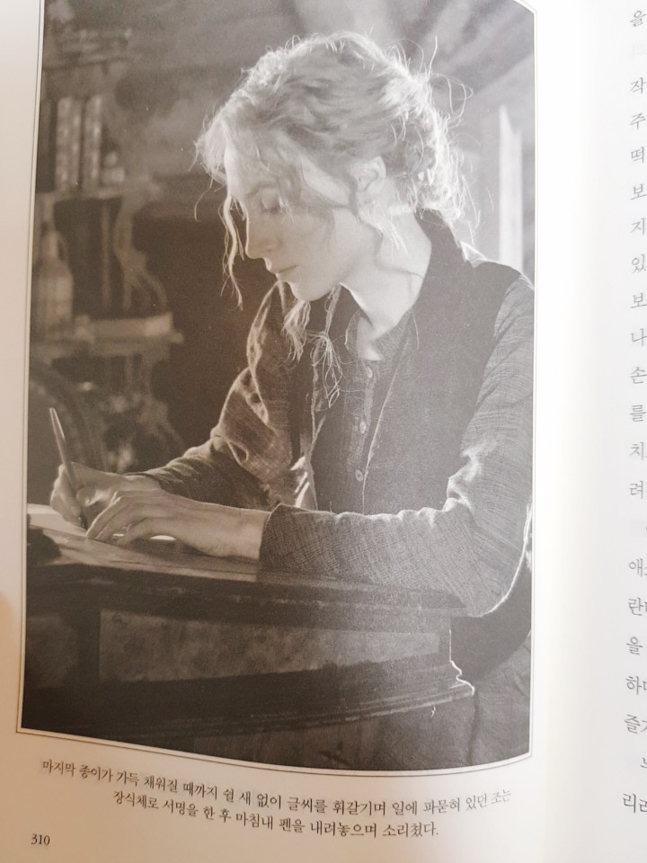 그러나 성인이 된 지금 1부 내용에 이어 2부가 포함된 원작소설을 정독하면서, 마치가문의 둘째, '조'에게 깊은 애정이 더해졌다. 조에게는 다른 자매들과는 다른 '강인함'이 분명히 존재했다. 자신의 부족한 부분을 인정할 수 있는 용기. 스케이트 사건은 조의 원고를 불태운 에이미의 잘못에서 비롯된 것임이 분명했음에도 동생을 용서하지 못하고 성급하게 화를 낸 자신을 자책하는가하면, 자신의 슬픔을 감수하고서라도 위급한 아버지를 위해 기꺼이 자신의 머리칼을 자를 수 있는 용기가 있었고 가족들에 대한 깊은 애정과 책임감으로 글을 써 내려갔다. 특히 2부 결말부에서는 마치 대고모로부터 물려받은 저택을 소년들을 위한 학교로 활용하며 보살핌과 애정이 필요한 소년들을 교육하는 역할을 맡은 만큼 '조'는 다른 어떤 자매들보다 가장 강인했으며 자신의 신념을 믿고 옳은 선택을 하면서, '성장하는 인물'이었다. 조가 완벽한 인물이 아닌 '성장하는 인물'이라는 사실이 내게는 더욱 와 닿았다. 해리 포터가 처음부터 완벽한 인물이 아니라 '성장하는 인물'이었던 것처럼, '조' 역시 일련의 사건들을 통해 깨달음을 얻고 자신이 걸어갈 길을 주체적으로 선택하는 인물이었다. 기실 성인기의 주요과제가 자신의 신념과 가치를 믿고 자신이 선택한 길을 똑바로 걸어가는 것인데, 이 점을 조를 통해서 배울 수 있었고, 그 때문에 유년시절의 내가 베스와 같았다면, 이제는 조와 같이 성장하고 싶다고 생각했다.