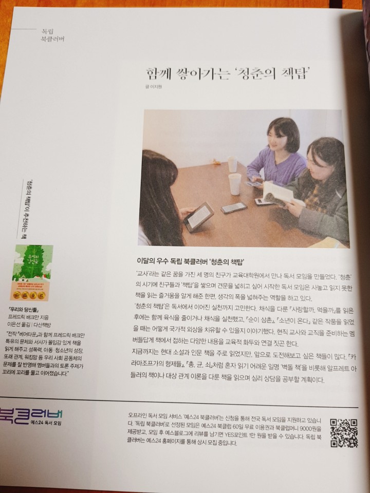 안녕하세요. 독립 북클러버 1기와 4기에 이어, 9기에도 함께하게 된 독서모임<청춘의 책탑>입니다어느덧 5월 31일인데, 우선 이번 리뷰를 쓰기 앞서 너무나 과분하겓 채널예스 5월호에 저희 모임의 인터뷰가 실리는 영광스런 기회를 주신 점, 진심으로 감사드립니다 (무려 펭수가 표지사진!! 이라 기뻤습니다.)