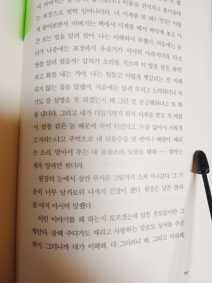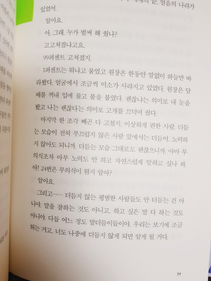 결국 왕십리역에서 스피치 사건을 망친 이후로 좌절감을 겪은 소년은 스프링 언어교정원에까지 나가지 않게 되고야 말지만.. 기실 답은 소년 자신에게 있다는 것을 이 책을 읽는 나를 포함한 독자들은 예감하고 있다. 이미 소년 내부에는 그 자신만의 가치가, 그 자신만의 힘이 있다. 아직 그것을 소년 자신이 찾지 못했을 뿐이다.