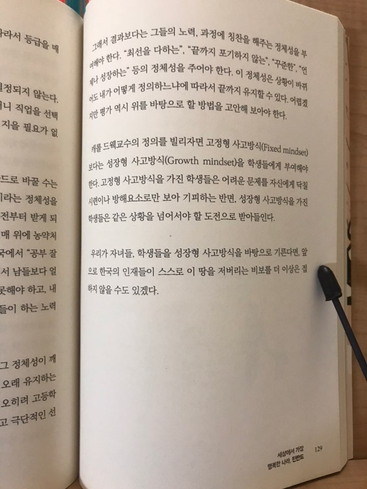 마지막으로 이 책 전체를 통틀어 가장 마음에 남았던 부분은 바로 제 5장, 「경쟁이 없는 학교」에서 언급하는 핀란드 사회의 교육에 대한 가치관이었다. 한국 교육은 ‘고정형 사고방식’으로 인해 한 개인이 정체성을 ‘성공’, ‘성취’, ‘성적’을 기준으로 형성하기 쉬운데 한국 교육이 변화되기 위해서는 ‘성장형 사고방식’을 지닐 필요가 있다.