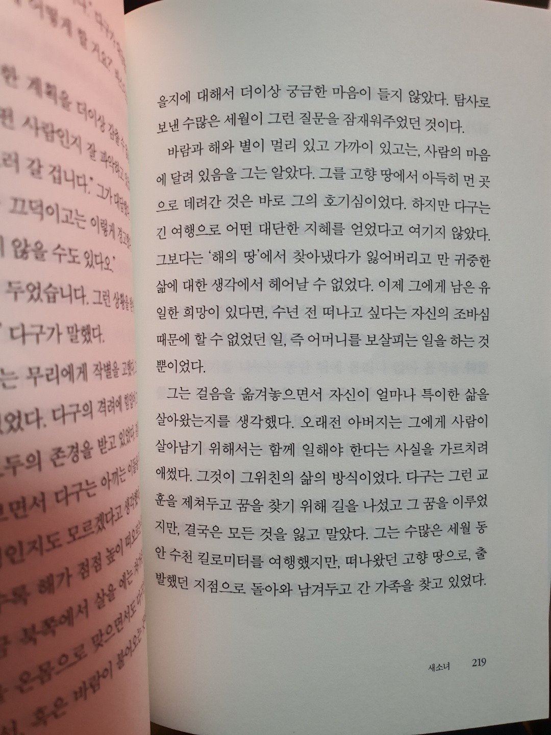 바람과 해와 별이 멀리 있고 가까이 있고는, 사람의 마음에 달려 있음을 그는 알았다. 그를 고향 땅에서 아득히 먼 곳으로 데려간 것은 바로 그의 호기심이었다. 하지만 다구는 긴 여행으로 어떤 대단한 지혜를 얻었다고 여기지 않았다. 그보다는 ‘해의 땅’에서 찾아냈다가 잃어버리고 만 귀중한 삶에 대한 생각에서 헤어날 수 없었다. 이제 그에게 남은 유일한 희망이 있다면, 수년 전 떠나고 싶다는 자신의 조바심 때문에 할 수 없었던 일, 즉 어머니를 보살피는 일을 하는 것 뿐이었다.