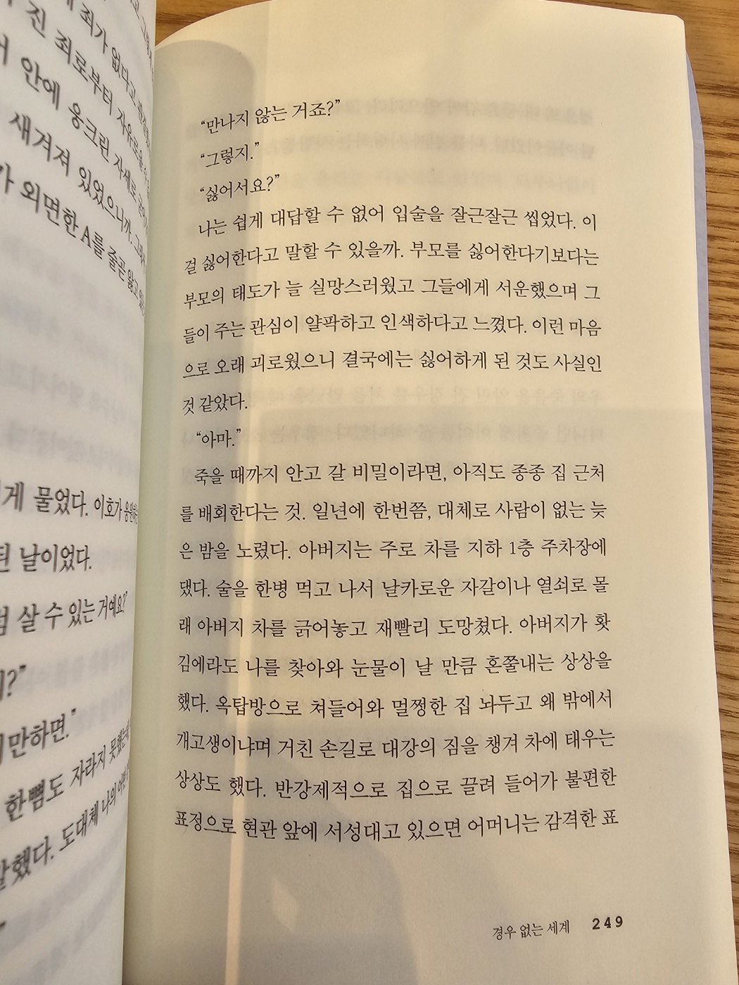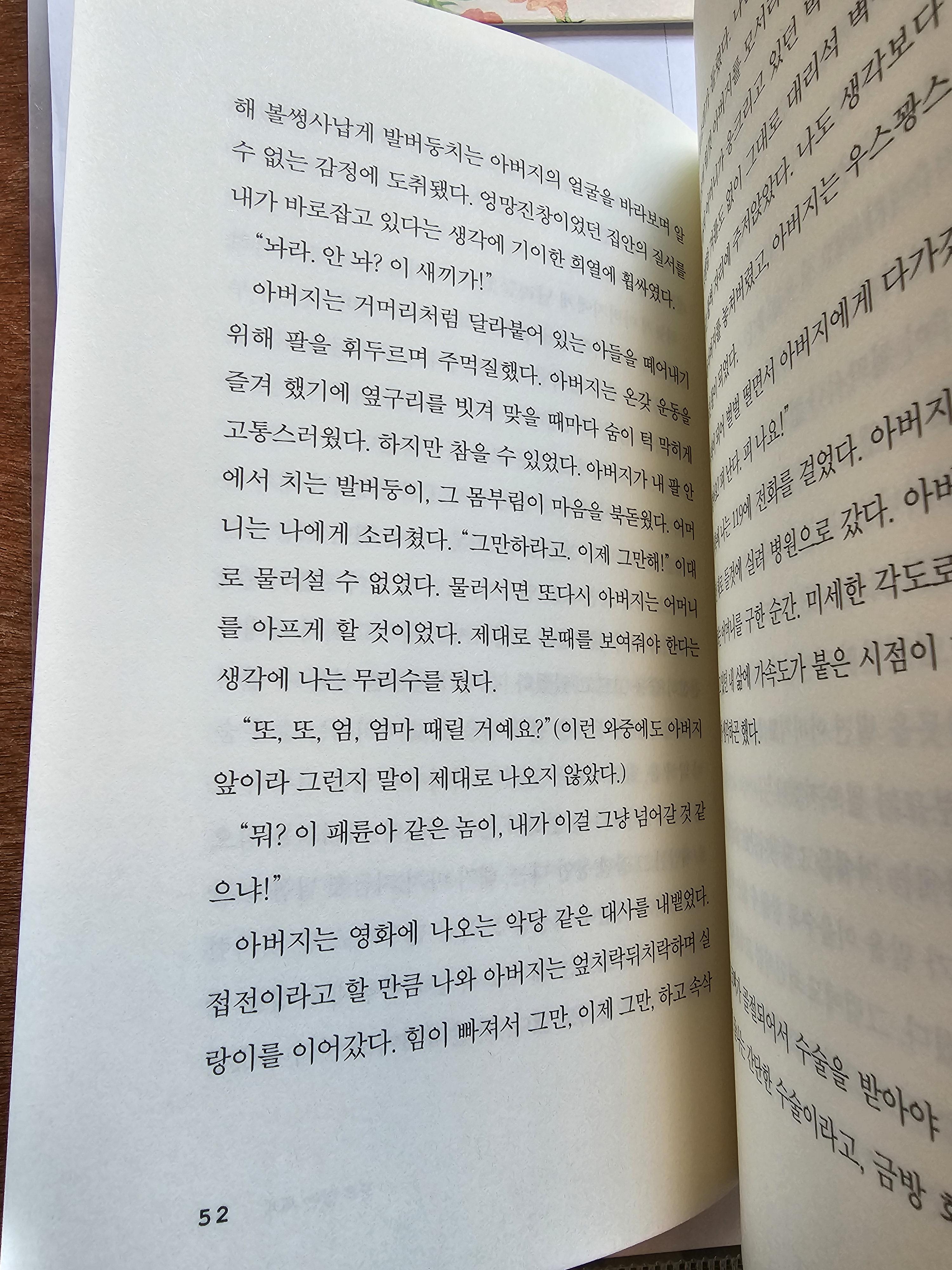 “아빠가…… 해로운 사람이라는 걸 인정하는 건 진짜 어려운 일이야. 그러고 싶지 않은데 나도 모르게 아빠의 행동에 이유를 찾아주게 되거든. 아빠도 아빠다운 아빠의 사랑을 제대로 못 받고 자라서 그런 거라고, 혹은 한 번도 여유를 갖고 살아 보지 않아서 그런 거라고, 살면서 누군가를 도와 본 게 처음이라, 은인이 되어 본 것도 처음이고 그런 식의 대접을 받아 본 것도 처음이라 거기서 아직까지도 벗어나지 못하고 있는 거라고. 내 머릿속에서 자꾸만 아빠를 가련한 사람으로 만들거든.”