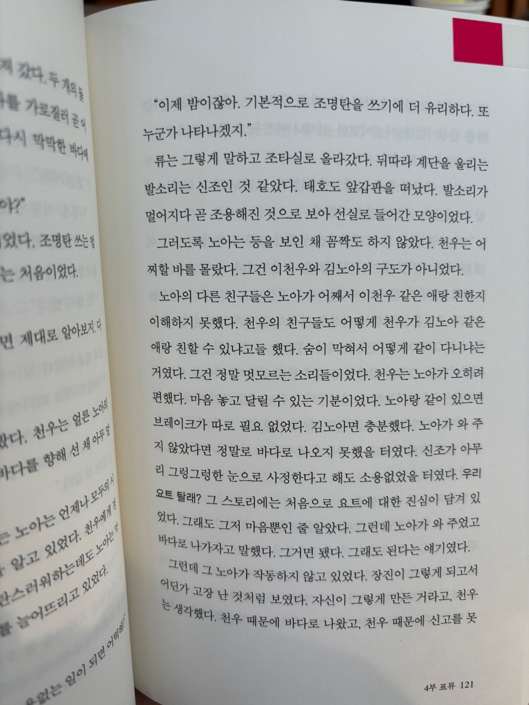 천우는 돛을 올리는 법을 모른다, 실은. 전혀 모르지는 않지만, 아는 것과 할 줄 아는 것은 전혀 다른 문제다. 그렇다면 돛만이 아니다. 천우는 요트 모는 법을 모른다, 실은. 그래도 인스타그램에 스토리를 올렸다. 돈 냄새 풀풀 나는 초고층 주상 복합 아파트를 배경으로 ‘신조호’는 잘리고 ‘천우’만 나오도록 비스듬한 각도로 요트를 찍은 사진이었다. 해시태그도 주르르 달았다. #우리집요트 #돛을올려버려 #천우신조호 #해운대라이프. 물론 #플렉스_릴랙스도 빠뜨리지 않았다. 평소 가장 애용하는 해시태그였다.