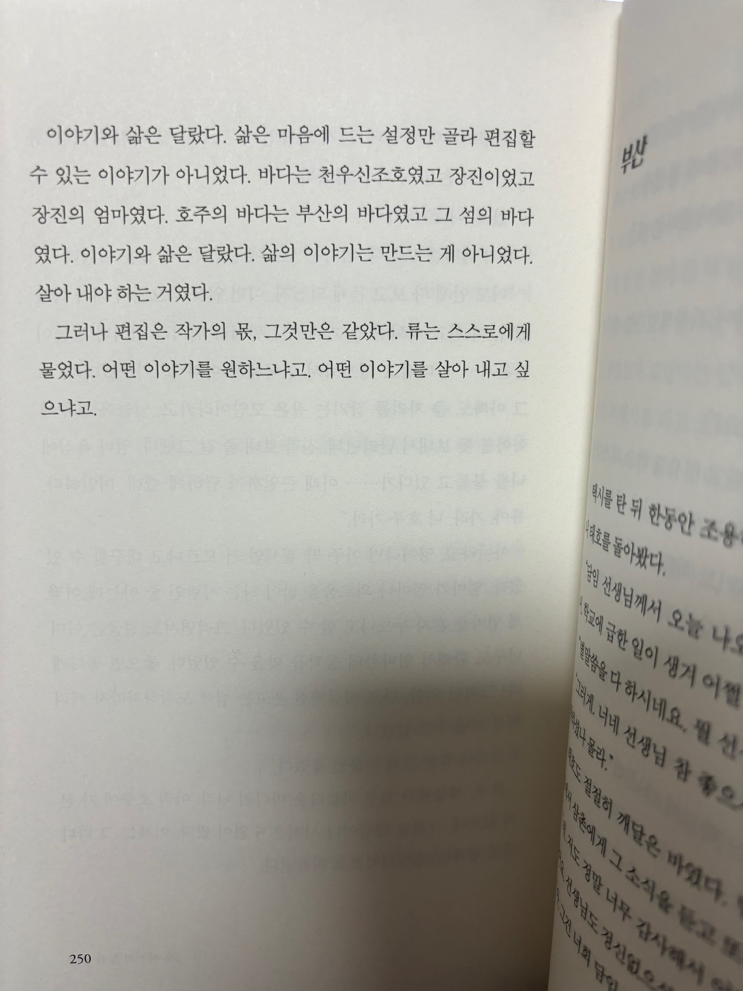 이야기와 삶은 달랐다. 삶은 마음에 드는 설정만 골라 편집할 수 있는 이야기가 아니었다. 바다는 천우신조호였고 장진이었고 장진의 엄마였다. 호주의 바다는 부산의 바다였고 그 섬의 바다였다. 이야기와 삶은 달랐다. 삶의 이야기는 만드는 게 아니었다. 살아 내야 하는 거였다. 그러나 편집은 작가의 몫, 그것만은 달랐다. 류는 스스로에게 물었다. 어떤 이야기를 원하느냐고, 어떤 이야기를 살아내고 싶으냐고.