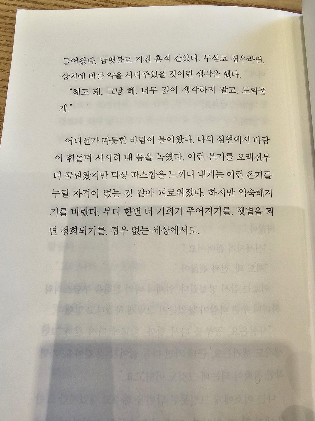 어디선가 따뜻한 바람이 불어왔다. 나의 심연에서 바람이 휘돌며 서서히 내 몸을 녹였다. 이런 온기를 오래전부터 꿈꿔왔지만 막상 따스함을 느끼니 내게는 이런 온기를 누릴 자격이 없는 것 같아 괴로워졌다. 하지만 익숙해지기를 바랐다. 부디 한번 더 기회가 주어지기를. 햇볕을 쬐면 정화되기를. 경우 없는 세상에서도.