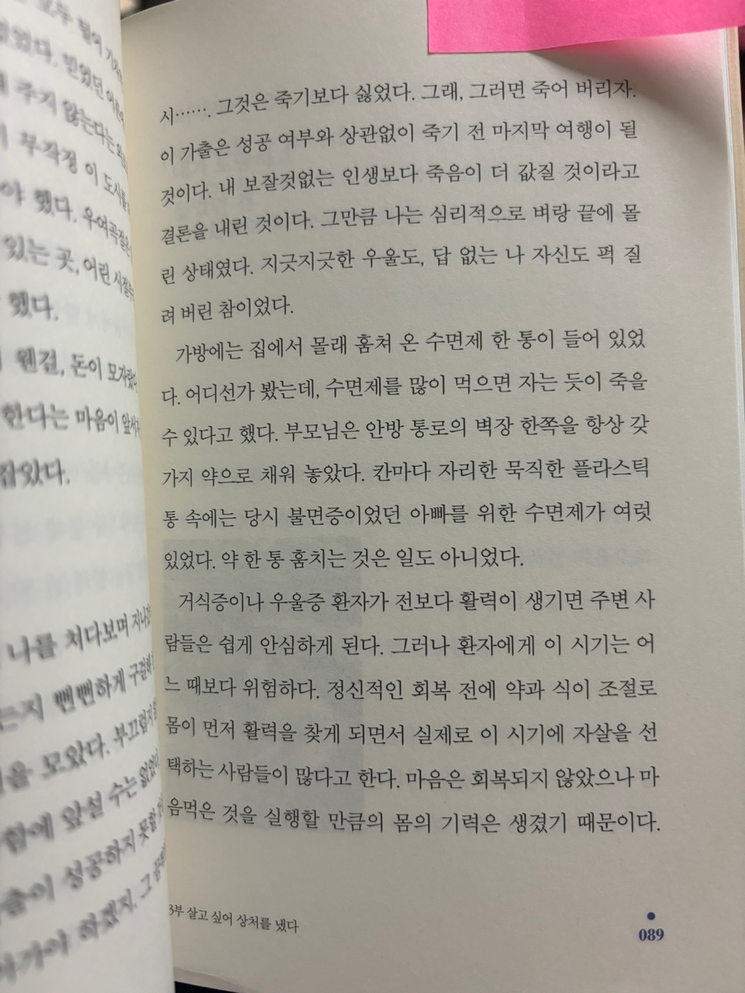 ‘가방에는 집에서 몰래 훔쳐 온 수면제 한 통이 들어 있었다. 어디선가 봤는데, 수면제를 많이 먹으면 자는 듯이 죽을 수 있다고 했다. (중략) 거식증이나 우울증 환자가 전보다 활력이 생기면 주변 사람들은 쉽게 안심하게 된다. 그러나 환자에게 이 시기는 어느 때보다 위험하다. 정신적인 회복 전에 약과 식이 조절로 몸이 먼저 활력을 찾게 되면서 실제로 이 시기에 자살을 선택하는 사람들이 많다고 한다. 마음은 회복되지 않았으나 마음먹은 것을 실행할 만큼의 몸의 기력은 생겼기 때문이다. ’