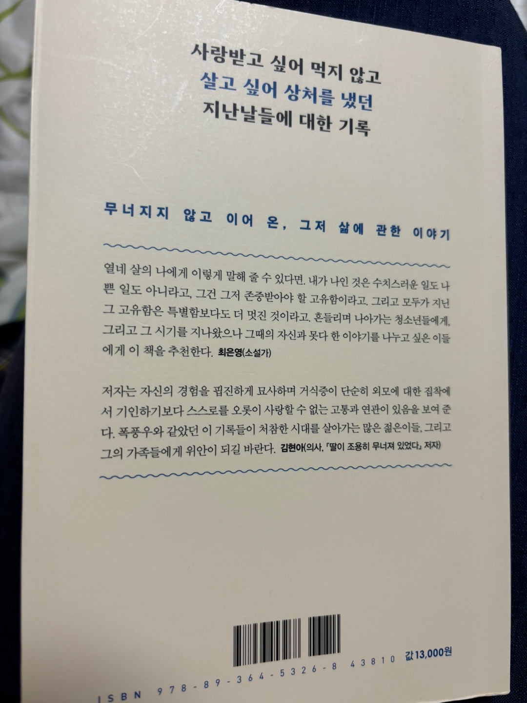 이 책은 저자가 거식증과 우울증을 지나 성장해왔다는 내용의 자기 고백이 담긴 단순한 에세이임을 넘어서, 충분히 사랑받거나 존중받지 못하고, ‘온전히 수용되는 무조건적인 경험’을 하지 못하고 그 경험을 갈구하는 오늘날의 청소년들의 모습을 너무나 잘 그려내고 있다.