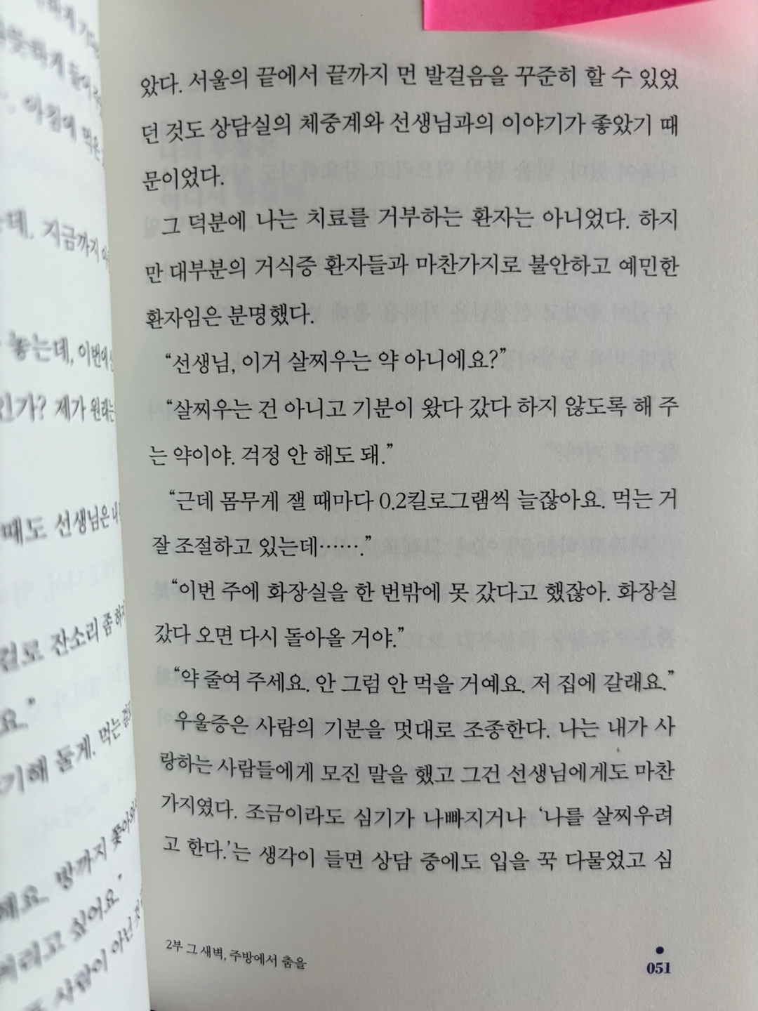 ‘물론 정신과 의사나 상담사가 모든 우울을 고쳐 주지는 못한다. 주벼에서도 상담이나 약물 치료를 병행했지만 호전되지 못하는 경우를 보았다. 살아온 시간이, 삶에 대처하는 방법이 다를 테니 문제를 벗어나는 법도 다를 수밖에 없다. 하지만 상담과 약물을 통해 문제가 나아지는 경우도 있은 병원은 삶의 낭떠러지 앞에서 시도해 볼 수 있는 주요한 방법 주 하나임은 틀림없다.